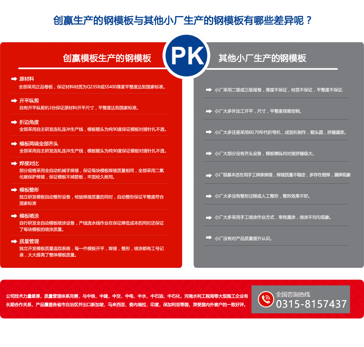 唐山創(chuàng)贏模板有限公司(原唐山豐南雙贏金屬結(jié)構(gòu)廠)始建于一九九七年,是具規(guī)模實力的組合模板生產(chǎn)企業(yè),公司自行設(shè)計制造的十二條上卷,連軋,連沖,整形,機械人焊接,調(diào)直,噴漆,打包鋼模板生產(chǎn),實現(xiàn)了自動化一條龍生產(chǎn),品質(zhì)優(yōu),效率高,規(guī)格型號為:寬度100-1200mm, 長度300-3000mm, 板厚1.8-4.0mm。 年產(chǎn)量可達(dá)200萬平方米,公司創(chuàng)新研制的輕型鋼框組合快拆鋼模板體系,是傳統(tǒng)組合小鋼模升級換代產(chǎn)品,可滿足房建,地下管廊,涵洞,公路,鐵路及各類施工企業(yè)的需要,輕型鋼框組合快拆鋼模板體系介紹及應(yīng)用,已在2017年《施工技術(shù)》雜志及《模板腳手架行業(yè)協(xié)會》雜志發(fā)表,詳情請查閱公司網(wǎng)站。 公司生產(chǎn)的噴漆鋼跳板,鍍鋅鋼跳板,采用連軋一次沖孔,承載力大,孔距均勻,外形美觀,年產(chǎn)量可達(dá)50萬塊,公司獨創(chuàng)的C型鋼生產(chǎn)線,以其產(chǎn)量高,強度大,成本低,交活迅速,在同行業(yè)占有較大優(yōu)勢,可與C型鋼廠家及各類施工企業(yè)合作共贏.